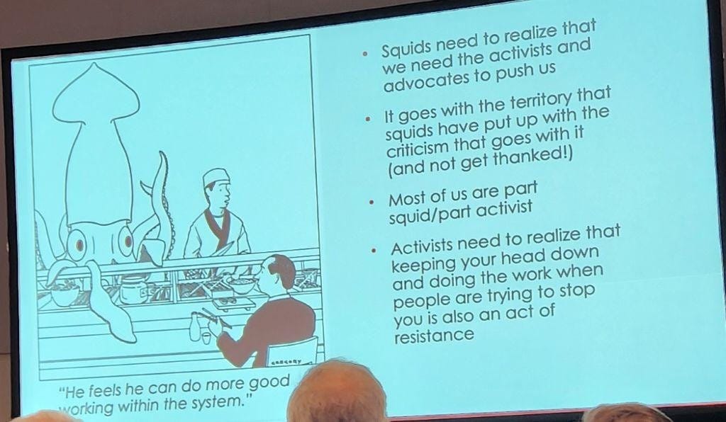 Despite the third bullet point that “Most of us are part squid/part activist”, Thorp has repeatedly set up the dichotomy of “we (AAAS) play inside ball” and “they (SUFS, et al.,) play outside ball. “Ball” here being methods of engaging politicians with regard to dealing with Trump’s attacks on science and democracy. This is fundamentally incorrect.